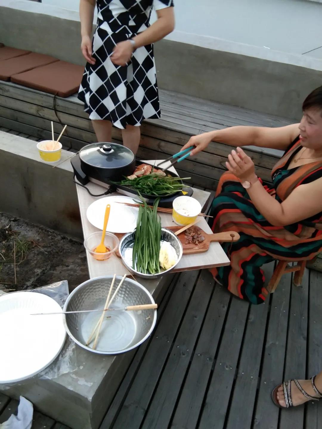 大家在積極忙碌著(zhù),擺盤(pán)、摘菜、串串,準備了整整兩大桌菜。